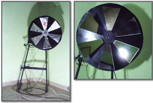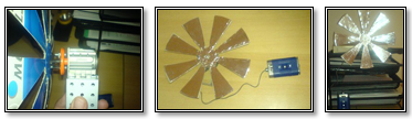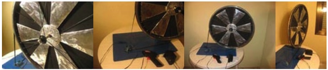 I used a bicycle wheel, black paper, aluminum foil, a small motor taken from a children’s game and a gamepad.