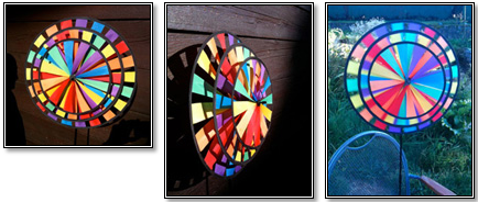 I glued CDs on each blade of an old unplugged ventilator that the wind makes rotate. The prism of their burning gives a rainbow. Rotating under the sun, it provides very colorful and bright reflections.