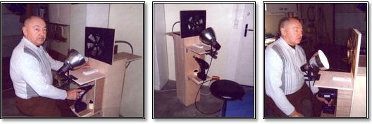 I simply used a record player and a long-playing (LP) vinyl record, 33⅓ rpm: I divided the record into 12 sections. I pasted 6 sections of white paper on it alternating them with the other 6 sections (letting the grooves of the vinyl show) and I covered these sections with a black matte color. Having placed the record player upright and at eye-level, I therefore had a record turning at 33⅓ rpm which I looked at using direct lighting, and I did this in sessions of 45 minutes every day. Every 3 or 4 minutes, I would cut the lighting and close my eyes for approximately one minute, occasionally doing head sways.